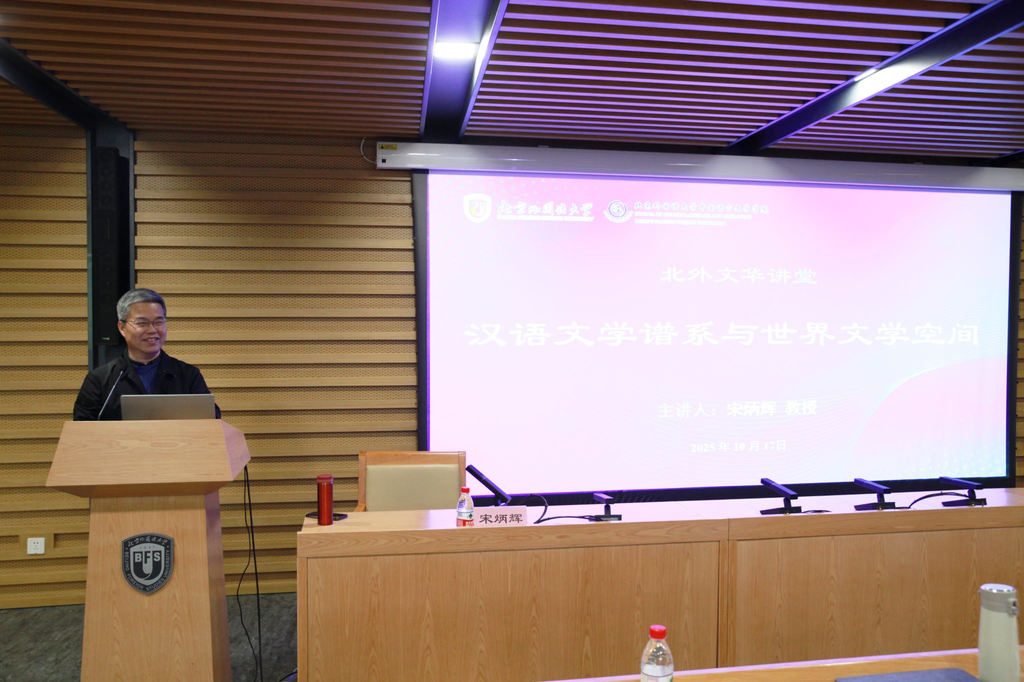 2025年10月17日下午,北京外国语大学中国语言文学学院举办“北外文华讲堂”系列讲座,邀请上海外国语大学文学研究院教授、《中国比较文学》主编、中国比较文学学会副会长宋炳辉教授作题为《汉语文学谱系与世界文学空间》的学术报告。此次讲座由中文学院院长何辉教授主持,研究生工作办公室主任罗静以及学院教师代表和学生百余人参加。